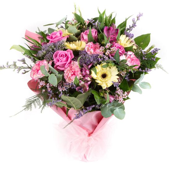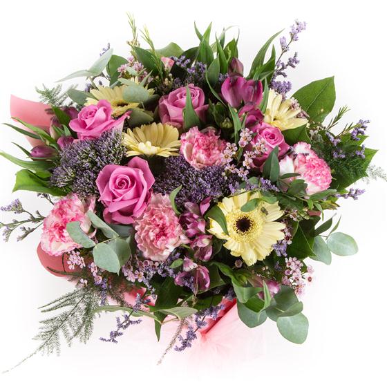 A delightful gift of lemon and pink blooms with a hint of lilac including roses and gerberas.