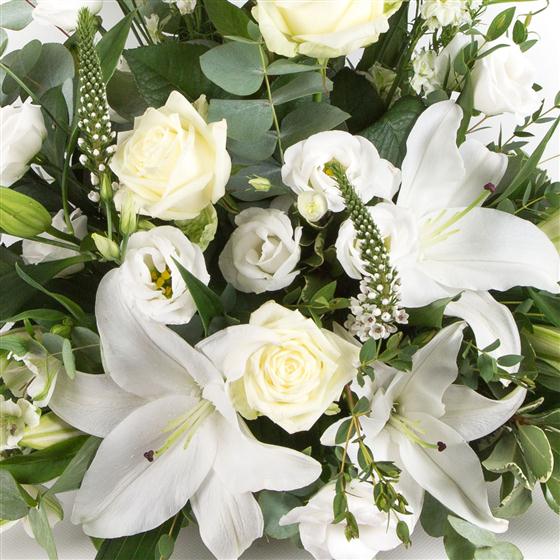 A front facing arrangement of white and cream blooms including roses, scented lilies and lisianthus.